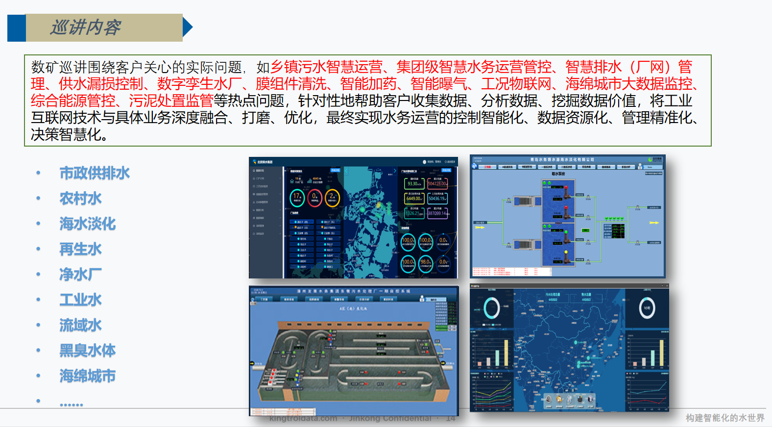 金控數據專注于智慧水務,提供從監測設備到軟件的全面解決方案,以"數礦"平臺為核心,實現水務智能化管理和運維服務,助力水務行業數字化轉型。